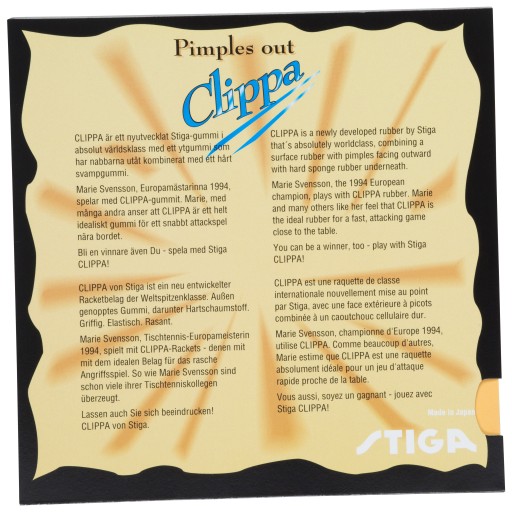 Всесвітньо відома наступальна гума. Завдяки правильному поєднанню структури поверхні і жорсткої губки, гума Clippa ідеально підходить для швидких атак біля столу.