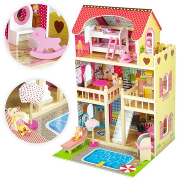 БОЛЬШОЙ ДЕРЕВЯННЫЙ ДОМИК ДЛЯ КУКОЛ МЕБЕЛЬ ДЛЯ+КУКЛЫ+БАССЕЙН