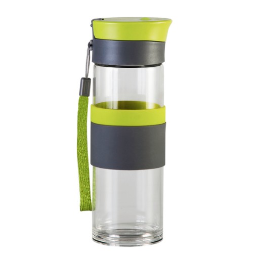 Герметичний флакон ємністю 440 мл. Виготовлений зі спеціального боросилікатного скла, яке є надзвичайно безпечним для здоров’я та легшим за традиційне скло. Пляшка оснащена тримачем для зап'ястя, браслетом і герметичною кришкою, яка запобігає витоку рідини. Без BPA.
