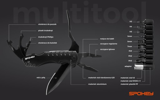 Spokey SX-ONE — багатофункціональний інструмент, який можна брати з собою куди завгодно. Це надзвичайно зручно та зручно. Має ергономічну форму, зручний хват і невеликий розмір, що забезпечує максимальний комфорт використання. Набір складається з 8 елементів: