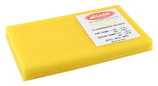 Мастило середнього вмісту фтору для гірських лиж, бігових лиж і сноубордів, продукт італійської компанії SOLDA, це модель Performance World Cup Yellow (каталожний номер 0820X) вагою 250 г (великий сервісний куб, без упаковки).