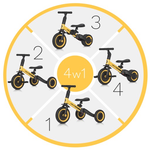 - Варіанти велосипедів: 4 в 1, триколісний велосипед (від 1 до 2 років дитини), триколісний велосипед (від 2 до 3 років), балансир (від 3 до 4 років), велосипед, двоколісний велосипед.