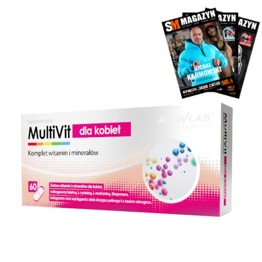 MultiVit для жінок Activlab Pharma – це дієтична добавка, що містить повний набір вітамінів і мінералів, розроблених спеціально для жінок. Продукт додатково збагачений лютеїном, L-цистеїном, L-метіоніном, лікопіном, колагеном і екстрактами хвоща і виноградних кісточок.