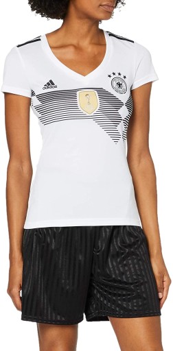 Жіноча домашня сорочка DFB натхненна легендарним дизайном 2018 року домашня сорочка DFB, виготовлена з тканини, що вбирає піт, і трохи ширша за автентичну версію. Тканий логотип DFB з'являється на грудях, а графіка в німецьких національних кольорах з'являється на внутрішній стороні коміра.