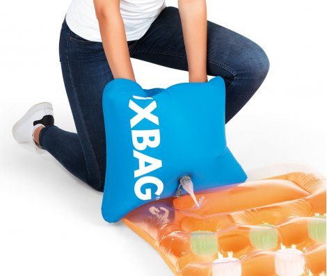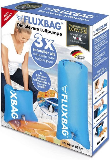 - Спосіб використання: fluxbag - це велика сумка, яку можна легко надути повітрям, потім закрити, вставити спеціальний наконечник і потім надути, наприклад, матрац або інші корисні на пляжі речі тощо.