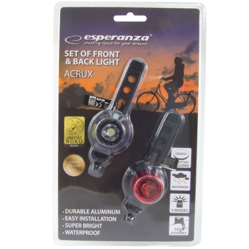 Велосипедний ліхтар Esperanza ACRUX складається з ПЕРЕДНЬОГО ліхтаря з білим світлом і ЗАДНЬОГО ліхтаря, що випромінює червоне світло.