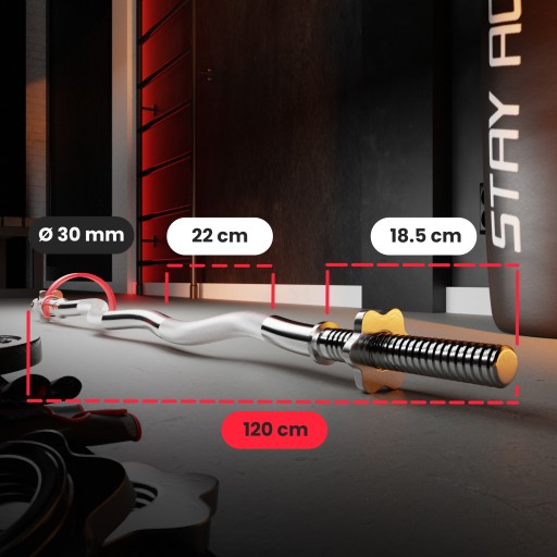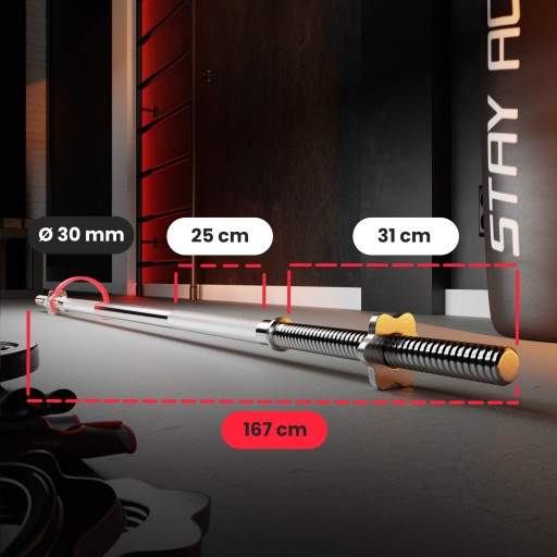 Конструкція горловини являє собою повний стрижень з хромованої сталі, отриманої в процесі гартування. Завдяки цьому ви можете навантажувати на нього до 150 кг, не боячись прогнутися або деформуватися. Діаметр штанги по всій довжині становить 30 мм, що робить її зручною і надійною в руці, а універсальний розмір підходить для всіх обважнювачів з отвором діаметром 31 мм.