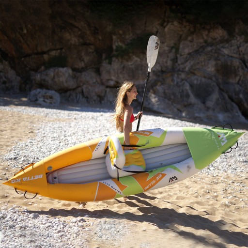 Байдарки Betta розроблені з урахуванням підвищеної довговічності. Вони забезпечують мобільність, легкість зберігання та легку установку. Модель BE-312 призначена для плавання на озерах і річках середньої складності. Цей надувний каяк важить всього 9 кг і має вантажопідйомність до 95 кг. Профільований кіль спрощує маневрування навіть для некваліфікованого користувача. Betta - це природний вибір для веслувальників початківців і середнього рівня.