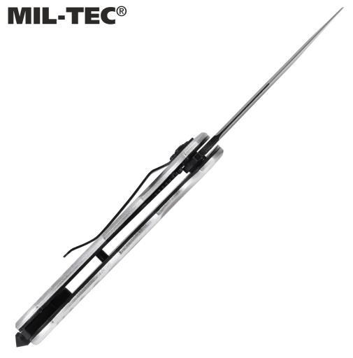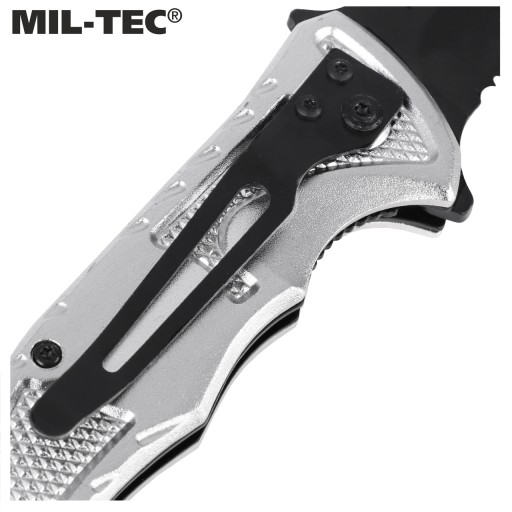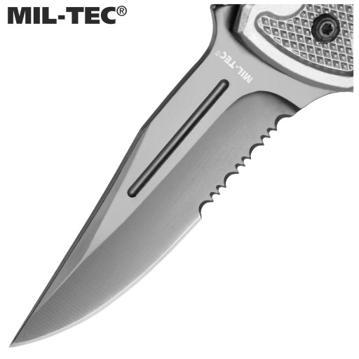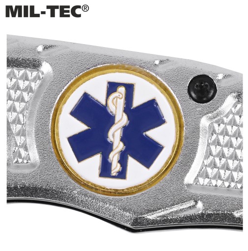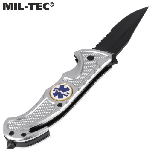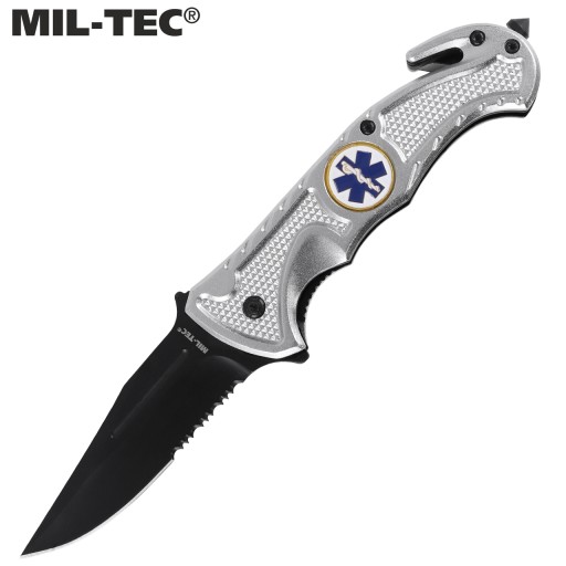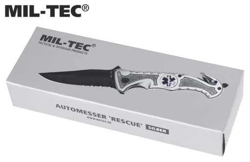 Рятувальний ніж "Rescue Paramedic" Mil-Tec. Лезо Drop Point виготовлено з високоякісної нержавіючої сталі 440 товщиною 2,5 мм. Все це було додатково окислено, що підвищило його стійкість до корозії та позбавило відблисків світла.