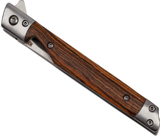 Пружинний ніж має подовжене лезо з кліпсовим профілем з блискучої нержавіючої сталі 420, яка стійка до пошкоджень і легко заточується.