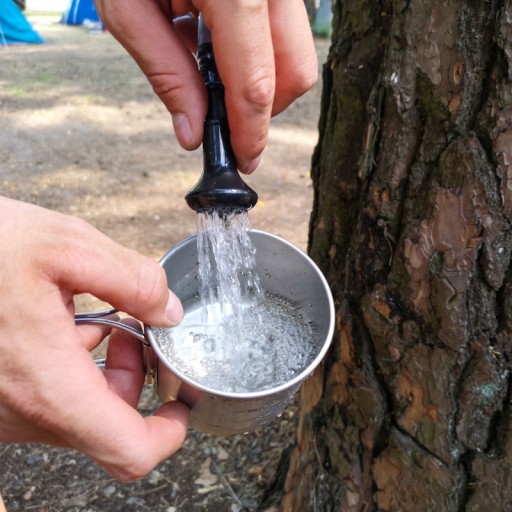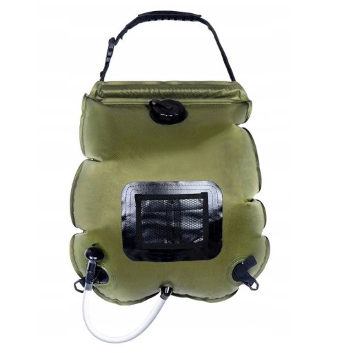 Підвісний похідний душ об'ємом 20 літрів. Портативний резервуар для води, який нагрівається сонячним світлом. Завдяки спеціальному матеріалу душ добре поглинає світло і вода швидко нагрівається. Ззаду вшитий термометр. Сумку можна скласти до дуже компактних розмірів. Душ має душову лійку зі шлангом і зручну ручку для підвішування.
