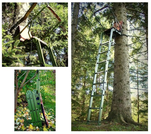 Практична драбина з сидінням і підставкою для зброї для мисливців - фотографів - спостерігачів. Завдяки малій вазі і можливості складання його можна використовувати буквально скрізь. Надзвичайно стійка конструкція, що підтримується міцними ніжками. Сидіння, покрите 100% поліестером з м'якою губкою, тканина кольору Camo, нековзка підніжка. Вся пофарбована зеленою антикорозійною фарбою.
