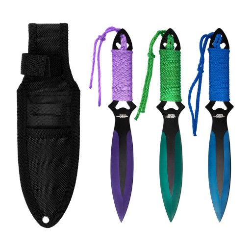 Набір з трьох метальних ножів. Клинок із симетричним профілем вістря списа виготовлений з чорнілої нержавіючої сталі. Зрізи кожного ножа забарвлені по-різному, так само, як і плетений шнур, вони пурпурні, сині та зелені.