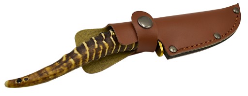 У комплект входить красивий ніж і дуже практичні піхви з натуральної шкіри, які акуратно підігнані до ножа і додатково закріплені металевою засувкою, яка запобігає випадковому вислизанню ножа з неї. Піхви додатково мають петлю, завдяки якій ми можемо прикріпити їх до пояса.