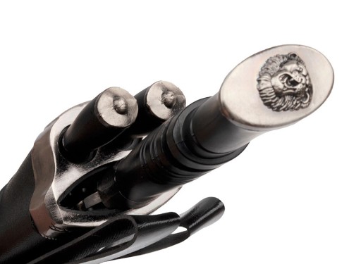 На голові декоративне гравіювання із зображенням рикаючого лева.