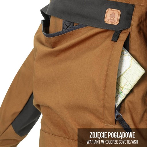 Куртка-анорак, виготовлена в рамках лінії Helikon-Tex Bushcraft. Спереду використовується тканина DuraCanvas, яка стійка до іскор і механічних пошкоджень. Спинка виконана з еластичної тканини StormStretch, завдяки чому куртка не сковує рухів. Все це дихаюче і вітронепроникне.