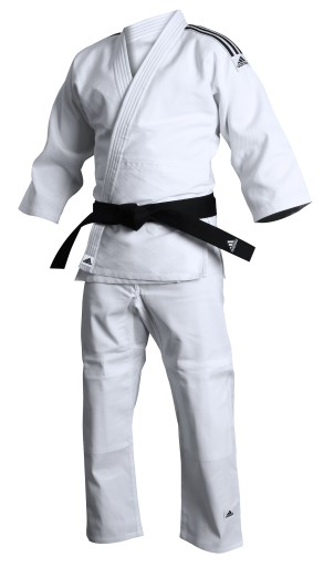 Дзюдога випускається білого кольору. Гладкі нашивки з чорними смужками і логотипом adidas на плечах. Внизу коміра є гладка нашивка з логотипом виробника. У комплект входить світшот і штани на зав'язках (розмір 140 см і штани на резинці 150 см). У комплект не входить пояс.