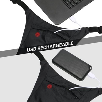 Kamizelka wyposażona jest w akumulator litowy, ładowany za pomocą wbudowanego kabla USB, który można podłączyć do portu USB komputera PC, laptopa, powerbanku, lub ładowarki telefonu.