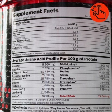 Składniki: hydrolizowany koncentrat białka serwatkowego (z mleka) , aromat, zagęszczacze: ksantan i guma guar; emulgator: sojowa lecytyna, substancje barwiące , ( dla smaku owoców leśnych – burak), substancje słodzące: sukraloza (Splenda ® ) i acesulfam-K.