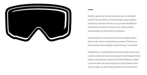 - Покриття Axiom - забезпечує найвищий рівень захисту очей від шкідливого впливу сонячних променів, одночасно забезпечуючи високий зоровий комфорт. Завдяки йому кольори і зображення стають більш виразними. У порівнянні з поляризаційним - покриття Axiom менш сприйнятливе до подряпин і має набагато кращі гідрофобні властивості, завдяки чому краплі води не затримуються на поверхні скла.