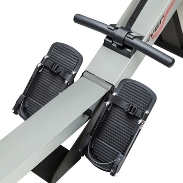 Wioślarz inSPORTline River ma rozbudowany system podparcia stopy, który pozwala regulować długość podnóżka , zaciskać klamrę blokującą i regulować pozycję pięty