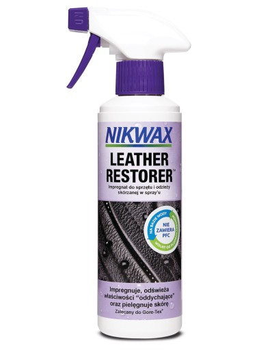 Засіб для регенерації шкіри. Спрей-просочення для одягу та шкіряних аксесуарів Просочує та покращує здатність тканин «дихати», зміцнює шкіру. Цей продукт слід використовувати на вживаному шкіряному одязі, щоб надати або зберегти його водонепроникні властивості. Перш ніж використовувати Nikwax Leather Restorer, спочатку очистіть обладнання за допомогою Nikwax Leather Cleaner (Зверніть увагу, що немає необхідності сушити одяг між чищенням і водонепроникністю).