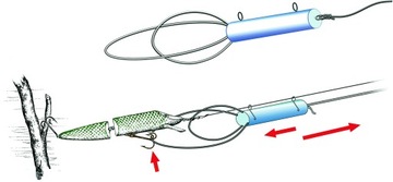 Ciężki cylinder prześlizgnie się na lince w przypadku zaczepienia przynęty o przeszkody. Jedna z dwóch miękkich pętli ze stali nierdzewnej owinie się wokół woblera, pozwalając na jego uwolnienie i odholowanie do brzegu/łodzi.