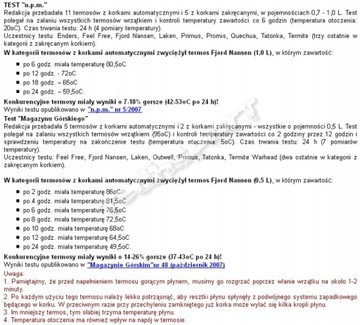 Termos 1L firmy FJORD NANSEN w wersji z zakręcanym korkiem. Zwycięzca niezależnego testu czasopisma "n.p.m."! Zapewnia bardzo długie trzymanie ciepła napoju, zostawiając w tyle całą konkuerncję. Dzięki zastosowaniu klasycznego otwierania korka wydłużono czas trzymania temperatury. Do napełnienia kubka wystarczy lekko odkręcić korek i przechylić termos - chroni to jego zawartość przed niepotrzebnym wychłodzeniem. Z zewnątrz termos pokryty jest specjalnym antypoślizgowym, gumowanym materiałem zapewniającym pewny chwyt. Posiada doskonałą izolację termiczną (dla płynów zarówno gorących jak i zimnych). Termos Fjord Nansen doskonale sprawdzi się na różnego rodzaju wyjazdach (w pociągu, autobusie czy w aucie) i wycieczkach turystycznych zarówno w mroźne jak i w cieplejsze dni. Bardzo łatwy w czyszczeniu.