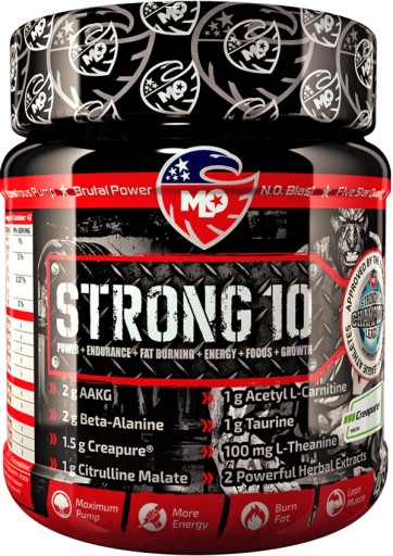 Потужність + Витривалість + Спалювання жиру + Енергія + Фокус + Зростання = ПОТУЖНІСТЬ 10. Наш бустер перед тренуванням забезпечує екстремальний накачування м'язів і приголомшливий ріст. Завдяки 10 потужним інгредієнтам, включаючи AAKG, бета-аланін і цитрулін малат, STRONG 10 надзвичайно підвищує рівень оксиду азоту, надаючи вам найбільш рельєфну та підтягнуту статуру.
