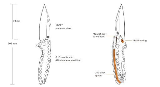 Профільована рукоятка ножа виготовлена з ламінату G10 і нержавіючої сталі 420 (вкладиші). Ніж має два замки, стандартний лайнер-замок і додатковий механізм Thumb-Up, який виконує роль основного запобіжника замка.