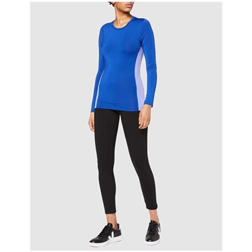 Приталена жіноча спортивна блузка. Спеціально скроєний крій не сковує рухів під час активності, а дихаючий матеріал допомагає підтримувати потрібну температуру тіла. Одяг модного синього кольору зі світлими смугами вздовж талії для візуального ефекту схуднення.
