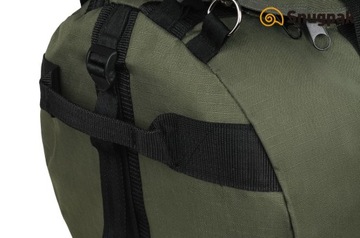 Uszyta z bardzo wytrzymałego i wodoodpornego materiału Heavy Duty 600D Rip-Stop, 100% nylon. Rip-Stop to specjalna technologia wzmacniania materiału, poprzez dodanie w splot tkaniny mocniejszych i grubszych włókien - charakterystyczna kratka. Wewnętrzna powierzchnia materiału została pokryta wodoodpornym filmem PVC. Warstwa PVC pełni dodatkową rolę usztywniającą materiał Rip-Stop, co pomaga lepiej chronić ładunek. Całe wnętrze torby zostało obszyte śliską nylonową podszewką, łatwą do utrzymania w czystości. Spód torby w czarnym kolorze, odporny na zabrudzenia. Solidny zamek główny, dwukierunkowy ekspres z dużymi suwakami. Możliwość założenia kłódki i plomby - zabezpieczenie przed otwarciem przez niepowołane osoby. Mocne taśmy nylonowe, klamry z tworzywa POM. Wytrzymałe wielokrotne szycia, wzmocnienia z taśm w newralgicznych punktach gwarantują długowieczność użytkowania, nawet pod dużym ciężarem ekwipunku.