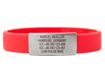 Na opasce Slim możesz umieścić wszystkie swoje najważniejsze dane, które mogą przydać się w krytycznej chwili. Zostaną one wygrawerowane laserowo na identyfikatorze ze stali nierdzewnej, dlatego są niezwykle trwałe. Dostępnych jest 8 kolorów opaski Slim.