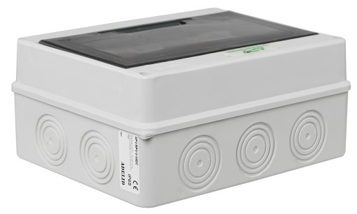 - 1x герметичний корпус для поверхневого монтажу, 8 модулів, з прозорими дверцятами та планкою N+PE, рейкою TH35,