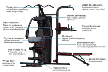 Atlas został wyposażony w stację motylkową, wyciąg górny, wyciąg dolny, ławkę prostą, ławkę dolną, poręcze, drążek do podciągania, prostownik nóg oraz modlitewnik dzięki czemu wytrenujesz całe ciało na jednym urządzeniu. Atlas od firmy Tag to wysokiej jakości sprzęt treningowy wyróżniający się bardzo dobrze dobranym layoutem.