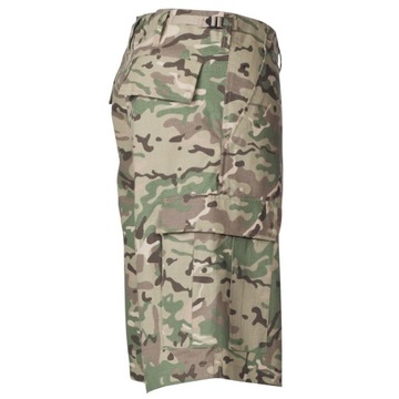- Spodenki, niemieckiej firmy MFH, Rip Stop, Operation-camo, zapinane na guziki mucha, dwie boczne kieszenie, dwie kieszenie tylne z patką i guzikami, dwie kieszenie boczne na nogawkach z patką i guzikami.