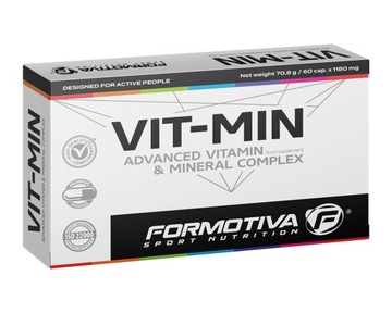 FORMOTIVA to profesjonalna linia produktów dedykowana sportowcom. Zaawansowane technologie, wysokiej jakości standardy oraz komponenty sprawiają, że produkty FORMOTIVA spełniają potrzeby najbardziej wymagających pracowników. Suplement diety VIT-MIN to produkt złożony z 2 kapsułek: VIT (czerwona kapsułka na dzień) i MIN (czarna kapsułka na noc). Produkt zawiera niezbędne witaminy z grupy B, w tym tiaminę, wintaminę B6, ryboflawinę oraz witaminę B12, przyczyniające się do prawidłowego metabolizmu energii w organiźmie. Ponad to produkt zawiera witaminy A, C i D, które pomagają w prawidłowym funkcjonowaniu układu odpornościowego oraz witaminę E, która pomaga w ochronie komórek przed stresem oksydacyjnym. Zawarty w produkcie magnez przyczynia się do zmniejszenia odczucia zmęczenia i znużenia, natomiast cynk pomaga utrzymać prawidłowy poziom testosteronu we krwi.