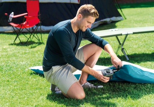 Під час подорожі, під час якої ми будемо використовувати надувні аксесуари, надійним буде електронасос на акумуляторі (6 x 'C'/LR14). Насос не оснащений акумуляторами. Універсальний насос полегшить накачування будь-якого аксесуара, який цього вимагає. Насос сумісний з продуктами, доступними на ринку, завдяки своїм 3 універсальним наконечникам. Призначення насоса - надувати повітрям і видувати повітря.