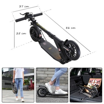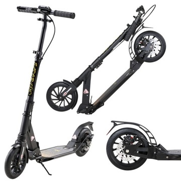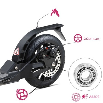 Duże koła z PU o średnicy 200 mm i wysokiej jakości łożyska kulkowe ABEC 9, idealnie do szybkiej jazdy. Mocna przyczepność rolek z pełnej gumy i tylny hamulec tarczowy zapewniają wysoki efekt hamowania i bezpieczne zatrzymanie. Oprócz hamulca tarczowego na tylnym kole hulajnoga posiada dodatkowy hamulec cierny tylnego koła (hamulec nożny). Antypoślizgowa powierzchnia stopnia zapewnia dobrą pozycję na hulajnodze. Dzięki podwójnemu zawieszeniu nierówności są amortyzowane nawet na wyboistych drogach. Zainstalowano podnóżek ułatwiający parkowanie. Bardzo duży odblask na tylnym chlapaczu zwiększa bezpieczeństwo w ciemne dni. Aluminiowa kierownica z szybkozłączką jest składana, a kierownica ma regulowaną wysokość w 4 pozycjach. Oznacza to, że hulajnoga rośnie razem z dzieckiem i może być używana również przez osoby dorosłe o wzroście do 190 cm. Potrójnie przykręcany uchwyt na kierownicy zwiększa kontrolę nad jazdą, a tym samym zapewnia lepsze wyczucie podczas jazdy. Szybko rozkładana hulajnoga jest idealnym towarzyszem na wszystkie trasy. Dzięki niewielkiej wadze jest bardzo łatwa w transporcie.