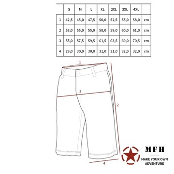 - Spodenki, niemieckiej firmy MFH, fleckarn, posiadają zamek błyskawiczny, dwie boczne kieszenie, oraz dwie boczne kieszenie na nogawkach z zatrzaskami.