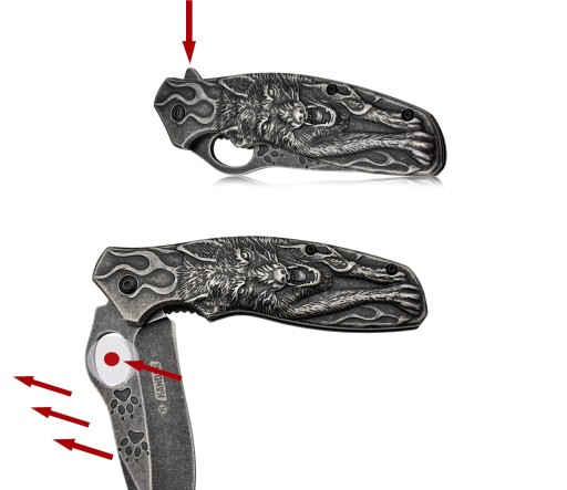 Ніж повністю ручний, але відкривається однією рукою. Застосування рішення, подібного до того, яке використовує Victorinox в мисливських ножах серії Hunter Pro - овальний отвір в лезі для великого пальця - дозволяє відкривати ніж однією рукою.