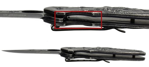 Сталева кліпса, встановлена на рукоятці, дозволяє прикріпити ніж до пояса, краю штанів або іншої частини одягу.