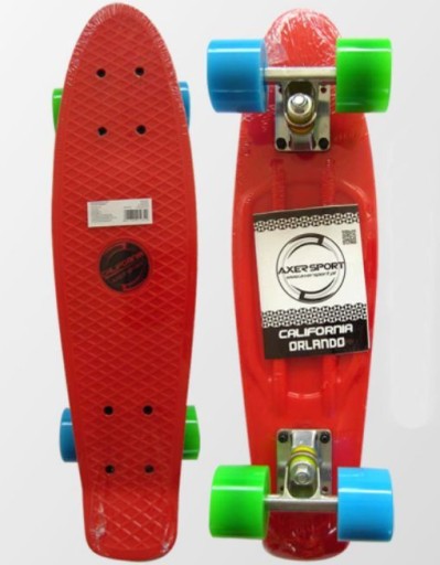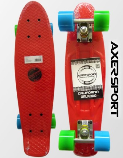 Скейтборд California фірми "Axer" - це модель з міцного пластику. Використання цього типу матеріалу забезпечує дуже високу міцність скейтборду, більшу, ніж у випадку звичайних скейтбордів з дерев'яної фанери.Fiszka характеризується класичним дизайном. Верхня сторона скейтборду має форму сітки, що забезпечує краще зчеплення, а компактні розміри дозволяють легко помістити його навіть у маленький рюкзак. Скейтборд оснащений міцними поліуретановими колесами.