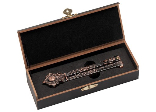 У набір входить чорна дерев'яна коробка з металевою засувкою, яка була розписана мотивами павука.