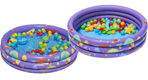 Барвистий космічний басейн збереже прохолоду в спекотні дні.Він складається з 3 рівних надувних кілець, які забезпечують стійкість всієї конструкції. Кожне кільце має блокатор, що перешкоджає витоку повітря. Басейн виготовлений з міцного вінілу товщиною 0,19 мм з оригінальним тисненим малюнком.