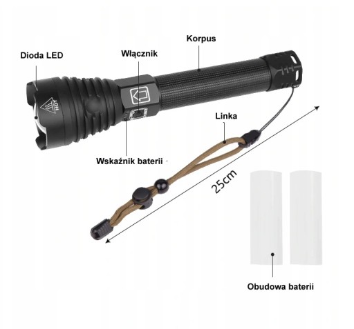 Ліхтарик працює від двох батарейок 18650 або 26650 (входять в комплект) і заряджається через популярний роз'єм microUSB за допомогою зарядного пристрою для телефону (кабель USB-micoUSB входить в комплект).