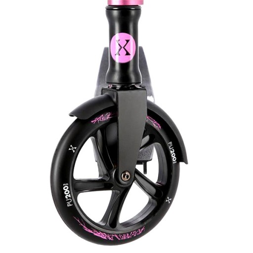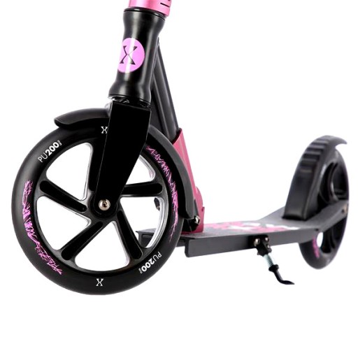 HM205, має два великих колеса розміром 200 мм. Це дозволяє ефективно маневрувати самокатом і долати нерівності. Підшипники класу ABEC9 підвищують стабільність і плавність водіння, а заднє ножне гальмо забезпечує безпеку.