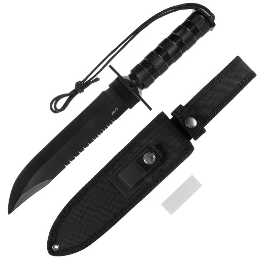 Великий вуличний ніж з фіксованим лезом. Лезо з профілем Bowie виготовлено з нержавіючої сталі 440А, покритої чорною фарбою. На задній частині леза є пилка для деревини, яка стане в нагоді в надзвичайних ситуаціях.
