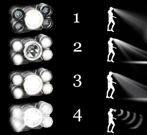 - 4 режими освітлення: 1 центральний діод безперервне світло, 4 бокових діода постійне світло, усі діоди постійне світло, усі діоди переривчасте світло