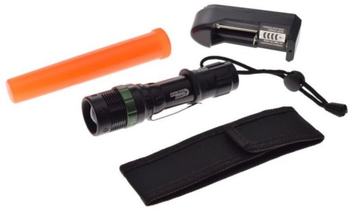 - Ліхтарик Alu ZOOM: 1 х 3 Вт Cree LED, світловий потік: 500 люмен, 3 режими роботи: 100% світловий промінь, 50% світловий промінь, спалах, ширина світлового променя регулюється поворотним зеленим кільцем, живлення : батарея 18650 (5800mAh) літій-іонна або 3 х ААА батареї, в комплекті: настінний зарядний пристрій, футляр, адаптер акумулятора